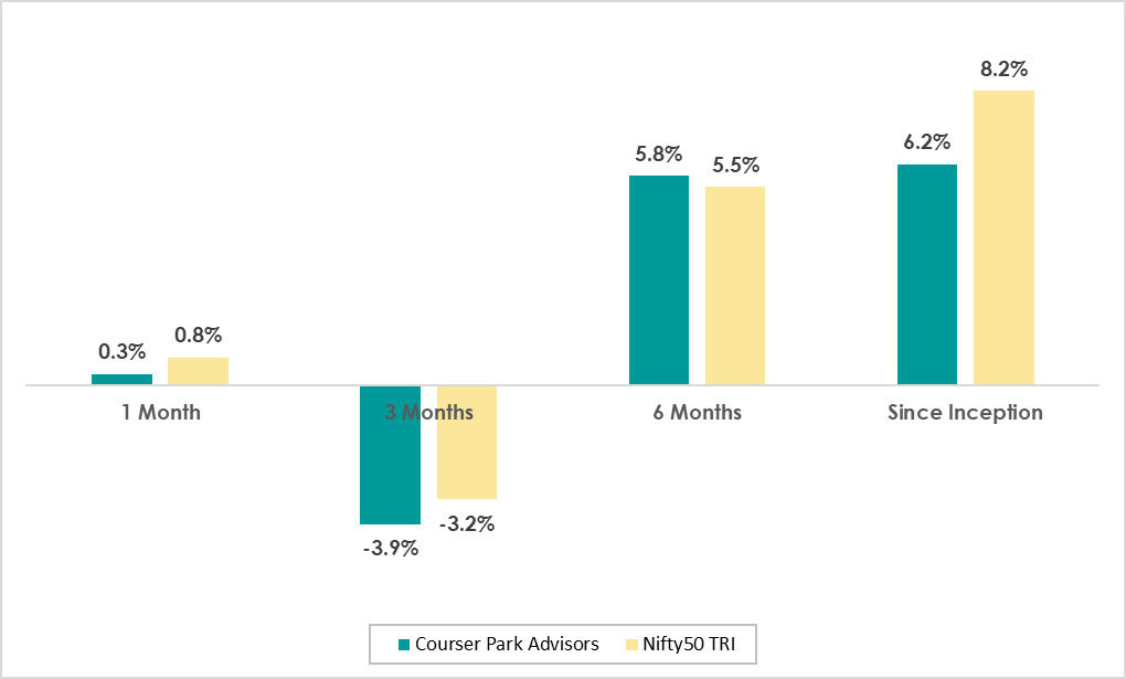 This Confidential Presentation is provided to the recipient solely for informational purposes. It does not constitute an offer to sell or a solicitation of an offer to buy any interests in any entity managed or advised by Courser Park Advisors LLP (the “Portfolio Manager”). Under no circumstances should this document be construed as an advertisement or public offering. No part of this document may be reproduced or distributed without the prior written consent of the Portfolio Manager. Performance data presented herein is calculated net of all fees, expenses, and applicable taxes, and includes all cash holdings and investments in liquid funds as required under SEBI guidelines. The performance reported in this material is consistent with the data reported to SEBI, and represents the aggregate firm-level performance of all portfolios managed by the Portfolio Manager. Please note that the performance-related information provided herein has not been verified by SEBI. This advertisement or material is designed to be truthful, fair, and clear. It avoids exaggerated claims and is not intended to mislead by omission or implication. There is no promise or guarantee of assured or fixed returns, either directly or indirectly. Any comparisons, if presented, are made in a fair manner with relevant context and do not aim to portray misleading superiority. All disclosures are based on information available in the Portfolio Manager’s official documents. This material may include forward-looking statements based on current expectations, which involve risks and uncertainties. Actual results may differ materially from those projected due to factors beyond the control of the Manager. Past performance is not indicative or a guarantee of future returns, and investor returns may vary depending on the timing of investments and other conditions. The information herein is current as of the date of this document. The Portfolio Manager makes no representation or warranty, express or implied, regarding the accuracy or completeness of this information. Any reference to market indices is solely for comparative purposes and may not reflect the composition or risk profile of the portfolios managed by the Portfolio Manager. Investments described herein are suitable only for sophisticated investors who fully understand and are willing to assume the associated risks. This material does not constitute legal, tax, or investment advice. Prospective investors are strongly encouraged to consult their own professional advisors regarding the implications of any potential investment. No governmental or regulatory authority, including the Securities and Exchange Board of India (SEBI), has passed upon the merits of the offering or the adequacy of this presentation.