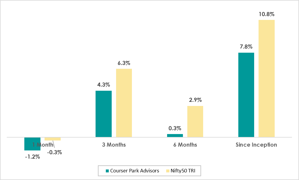 This Confidential Presentation is provided to the recipient solely for informational purposes. It does not constitute an offer to sell or a solicitation of an offer to buy any interests in any entity managed or advised by Courser Park Advisors LLP (the “Portfolio Manager”). Under no circumstances should this document be construed as an advertisement or public offering. No part of this document may be reproduced or distributed without the prior written consent of the Portfolio Manager. Performance data presented herein is calculated net of all fees, expenses, and applicable taxes, and includes all cash holdings and investments in liquid funds as required under SEBI guidelines. The performance reported in this material is consistent with the data reported to SEBI, and represents the aggregate firm-level performance of all portfolios managed by the Portfolio Manager. Please note that the performance-related information provided herein has not been verified by SEBI. This advertisement or material is designed to be truthful, fair, and clear. It avoids exaggerated claims and is not intended to mislead by omission or implication. There is no promise or guarantee of assured or fixed returns, either directly or indirectly. Any comparisons, if presented, are made in a fair manner with relevant context and do not aim to portray misleading superiority. All disclosures are based on information available in the Portfolio Manager’s official documents. This material may include forward-looking statements based on current expectations, which involve risks and uncertainties. Actual results may differ materially from those projected due to factors beyond the control of the Manager. Past performance is not indicative or a guarantee of future returns, and investor returns may vary depending on the timing of investments and other conditions. The information herein is current as of the date of this document. The Portfolio Manager makes no representation or warranty, express or implied, regarding the accuracy or completeness of this information. Any reference to market indices is solely for comparative purposes and may not reflect the composition or risk profile of the portfolios managed by the Portfolio Manager. Investments described herein are suitable only for sophisticated investors who fully understand and are willing to assume the associated risks. This material does not constitute legal, tax, or investment advice. Prospective investors are strongly encouraged to consult their own professional advisors regarding the implications of any potential investment. No governmental or regulatory authority, including the Securities and Exchange Board of India (SEBI), has passed upon the merits of the offering or the adequacy of this presentation.
