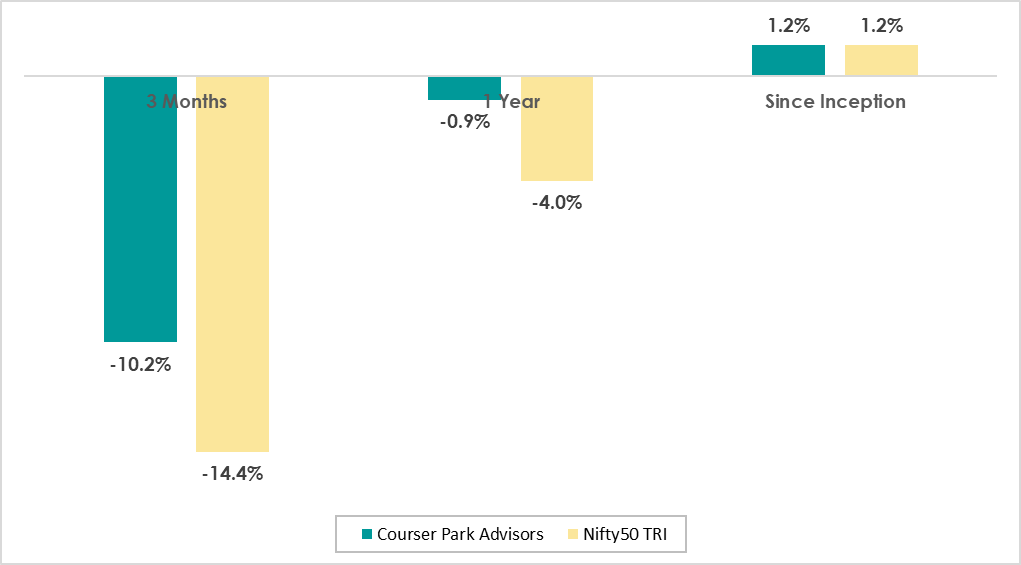 This Confidential Presentation is provided to the recipient solely for informational purposes. It does not constitute an offer to sell or a solicitation of an offer to buy any interests in any entity managed or advised by Courser Park Advisors LLP (the “Portfolio Manager”). Under no circumstances should this document be construed as an advertisement or public offering. No part of this document may be reproduced or distributed without the prior written consent of the Portfolio Manager. Performance data presented herein is calculated net of all fees, expenses, and applicable taxes, and includes all cash holdings and investments in liquid funds as required under SEBI guidelines. The performance reported in this material is consistent with the data reported to SEBI, and represents the aggregate firm-level performance of all portfolios managed by the Portfolio Manager. Please note that the performance-related information provided herein has not been verified by SEBI. This advertisement or material is designed to be truthful, fair, and clear. It avoids exaggerated claims and is not intended to mislead by omission or implication. There is no promise or guarantee of assured or fixed returns, either directly or indirectly. Any comparisons, if presented, are made in a fair manner with relevant context and do not aim to portray misleading superiority. All disclosures are based on information available in the Portfolio Manager’s official documents. This material may include forward-looking statements based on current expectations, which involve risks and uncertainties. Actual results may differ materially from those projected due to factors beyond the control of the Manager. Past performance is not indicative or a guarantee of future returns, and investor returns may vary depending on the timing of investments and other conditions. The information herein is current as of the date of this document. The Portfolio Manager makes no representation or warranty, express or implied, regarding the accuracy or completeness of this information. Any reference to market indices is solely for comparative purposes and may not reflect the composition or risk profile of the portfolios managed by the Portfolio Manager. Investments described herein are suitable only for sophisticated investors who fully understand and are willing to assume the associated risks. This material does not constitute legal, tax, or investment advice. Prospective investors are strongly encouraged to consult their own professional advisors regarding the implications of any potential investment. No governmental or regulatory authority, including the Securities and Exchange Board of India (SEBI), has passed upon the merits of the offering or the adequacy of this presentation.